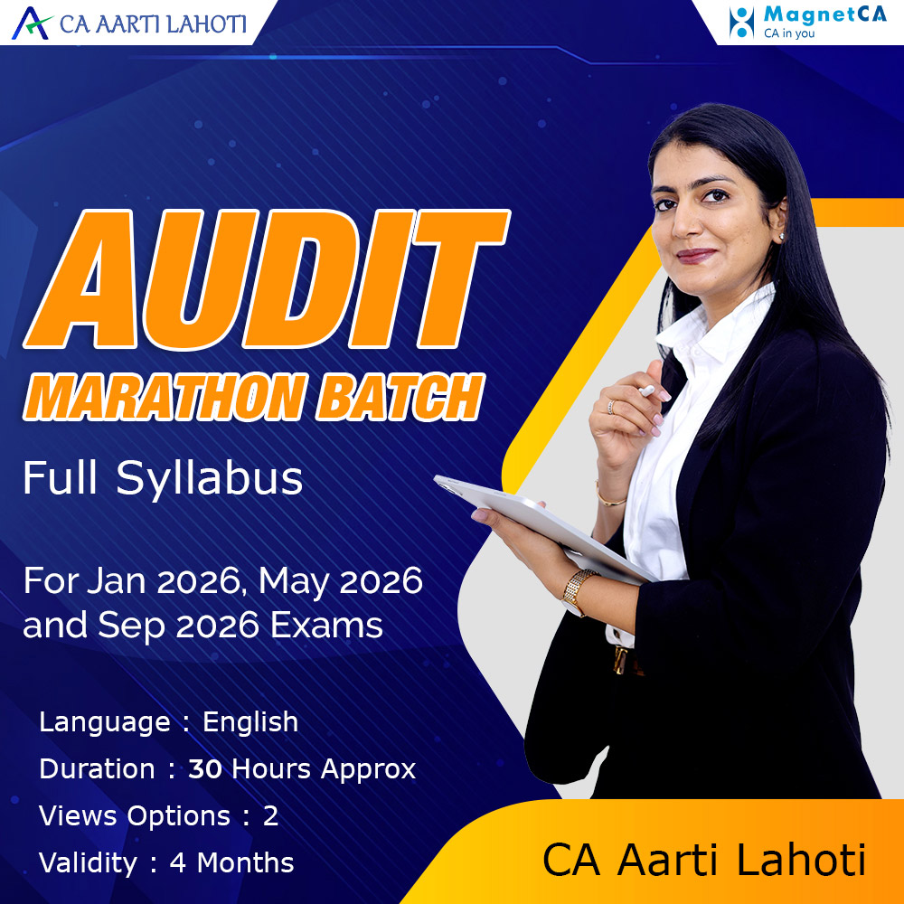 Subject: Audit Marathon Full Syllabus (English Recording) Course: CA Final Duration: 30 Hours Approx Validity: 4 Months Language: English Views Options: 3 Applicable for: Jan 2026, May 2026 and Sep 2026 Faculty Name: CA Aarti Lahoti